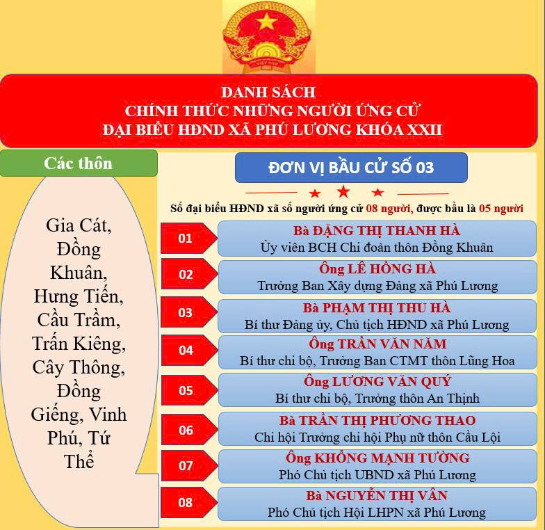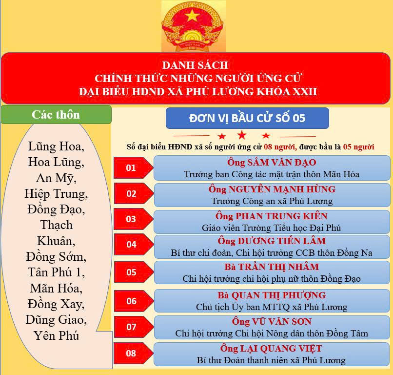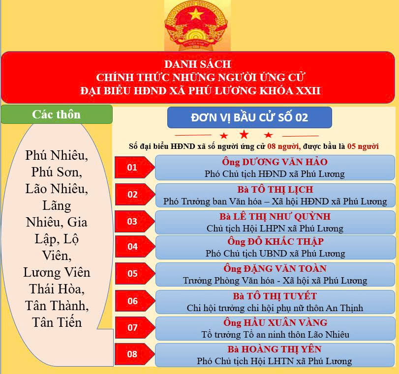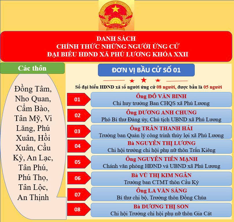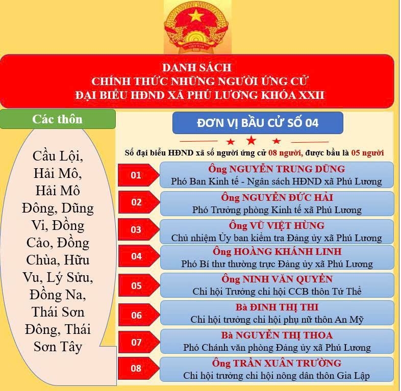 Theo đó, công bố danh sách chính thức 40 người ứng cử đại biểu Hội đồng nhân dân xã Phú Lương khóa XXII, nhiệm kỳ 2026-2031, tại 05 đơn vị bầu cử.