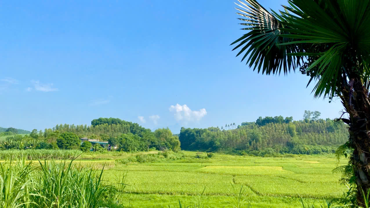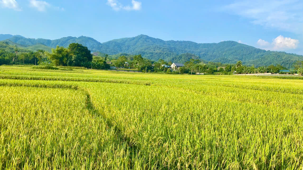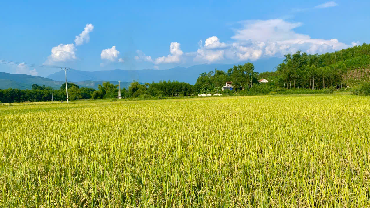 Trên những thửa ruộng vàng óng, bà con nông dân phấn khởi đưa máy gặt vào đồng, tiếng máy nổ xen lẫn tiếng cười nói rộn rã. Cánh đồng rộng lớn được bao bọc bởi núi non xanh thẳm, tạo nên một bức tranh thiên nhiên tuyệt đẹp: trời xanh, mây trắng, lúa chín vàng, người nông dân hăng say lao động.