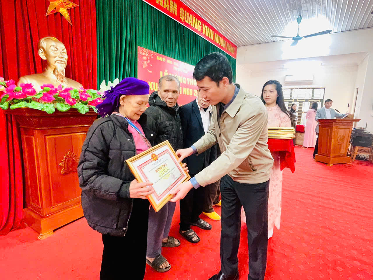 Đồng chí Hoàng Khánh Linh, Phó Bí thư Đảng ủy xã trao Giấy mừng thọ cho các cụ 80 tuổi