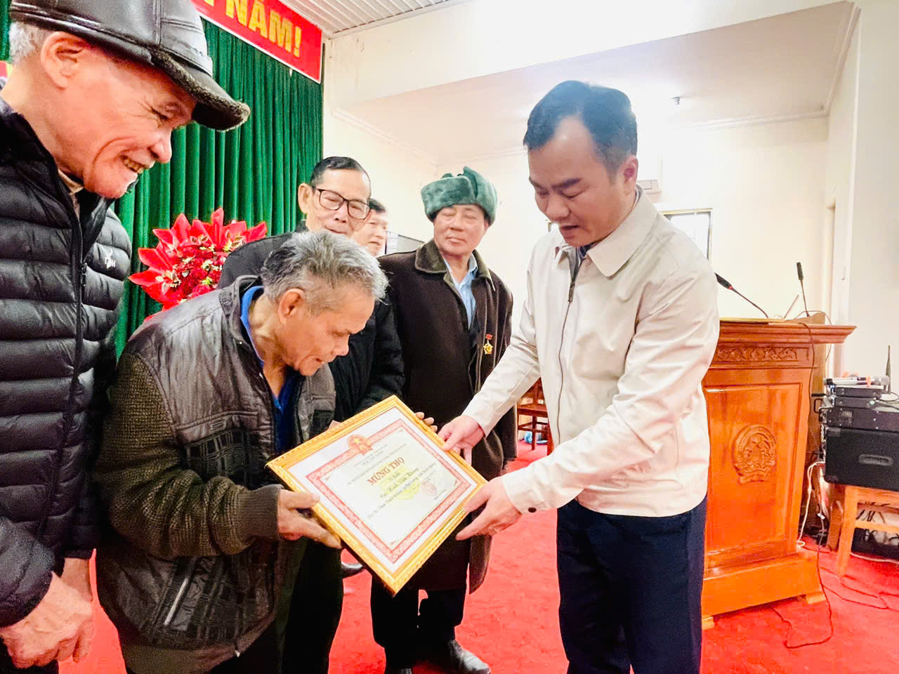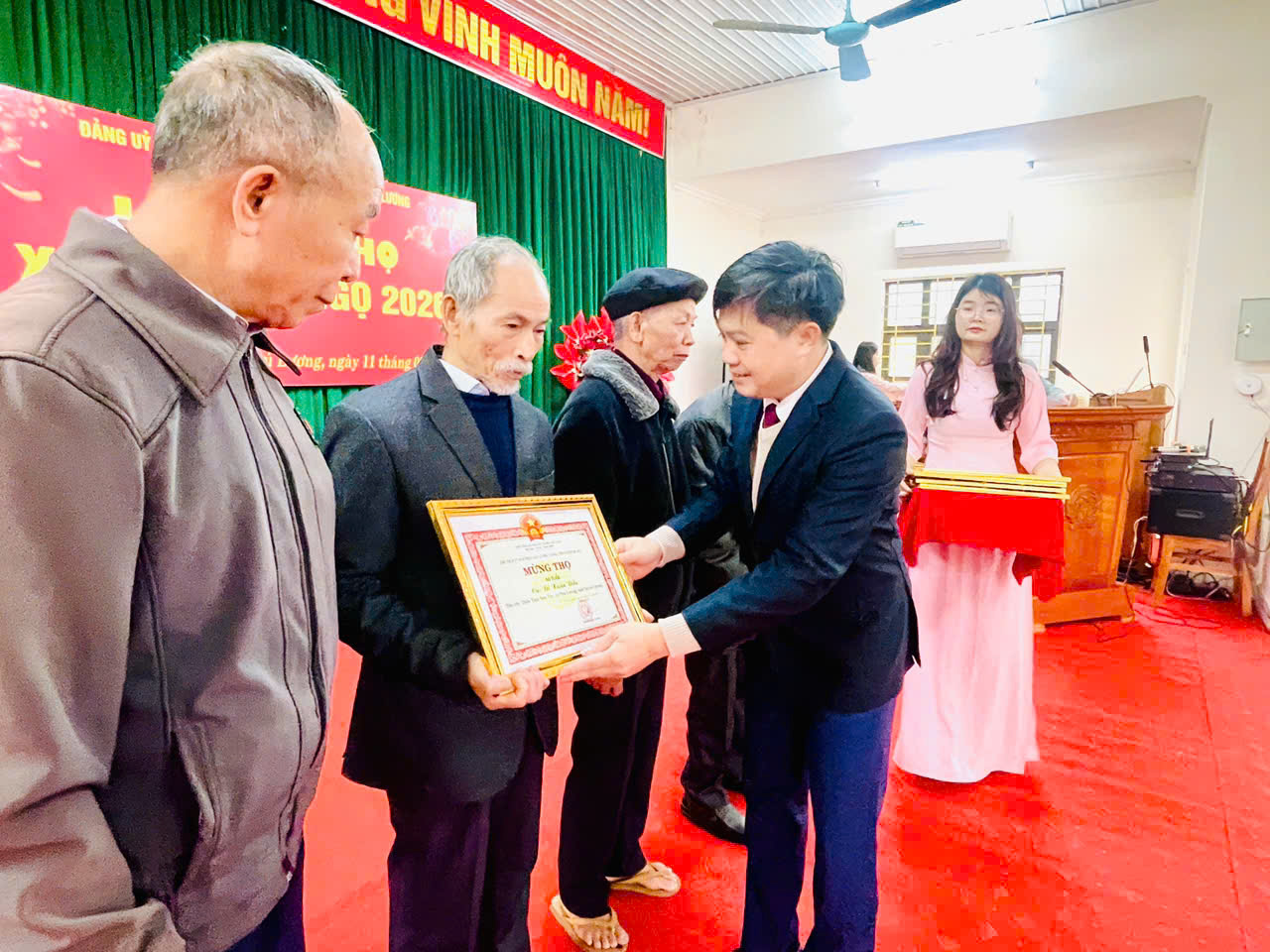 Đồng chí Dương Anh Chung, Phó Bí thư Đảng ủy, Chủ tịch UBND xã trao Giấy mừng thọ cho các cụ 75 tuổi