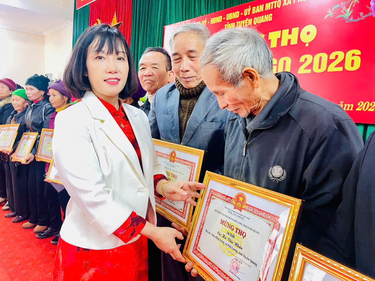 Đồng chí Phạm Thị Thu Hà, Bí thư Đảng ủy, Chủ tịch HĐND xã trao Giấy mừng thọ cho các cụ 85 tuổi
